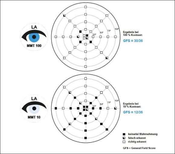 Dieses MMT-Protokoll zeigt einen kompletten Messdurchlauf mit 100% und 10% Kontrast an einem linken Auge. Aus beiden Ergebnis-Scors (100% = 30 v. 36 imd 10% = 12 v. 36) wurde das sog. General-Field-Score-Verhältnis (GFS) berechnet (12/30 = 0,4). Mit einem Score von 0,4 liegt die 86-jährige Klientin unter der Altersnorm (siehe Koordinatensystem) und sollte sich einer ophthalmologischen Untersuchung unterziehen. Es ist zu erwähnen, dass die Klientin am RA bereits an einer bestehenden AMD leidet, am LA jedoch noch immer einen Visus von 0,8 erreicht. Erst durch die 10%-MMT-Messung wird die auch am LA bestehende Auffälligkeit sichtbar.