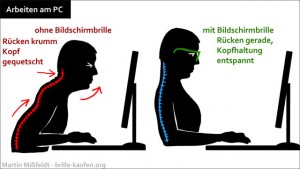Dann ist es Sache des Arbeitgebers, dem Arbeitnehmer eine entsprechende „Computerbrille“ zu bezahlen. Das Ganze fällt unter den „Gesundheitsschutz am Arbeitsplatz“. Wenn man dauerhaft den Rücken und Nacken in unnatürlicher Weise belastet, um am Bildschirm lesen zu können, dann wirkt sich das im Laufe der Zeit negativ auf die Gesundheit aus: Kopfschmerzen bis hin zu Migräne, aber auch Nackenverspannungen und Rückenleiden können die Folge sein.