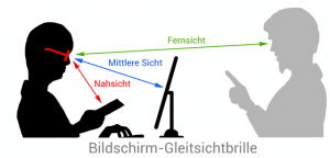 Das Besondere einer Bildschirmarbeitsplatzbrille ist der Abstand, für den sie optimiert ist. Normalerweise ist das Brillenglas zum Korrigieren einer Weitsichtigkeit (Hyperopie) oder Altersweitsichtigkeit (Presbyopie) für eine Sehdistanz von etwa 30 cm optimiert. Das ist die Entfernung, in der man normalerweise liest oder Handarbeit verrichtet. Aber bei der Arbeit vor einem PC-Bildschirm hat man ein Problem: der ist üblicherweise ca. 50 cm bis 70 von den Augen entfernt. Aus gutem Grund sollte der Abstand nicht zu gering sein: Ein PC-Monitor ist eine Strahlungsquelle – und wenn man stundenlang in eine solche Lichtquelle schaut, dann belastet das die Augen erheblich.