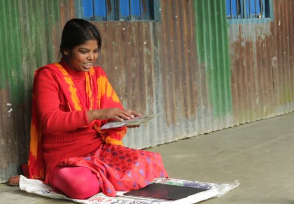 Zwei Mitarbeiter des lokalen CBM-Partners Gana Unnayan Kendra brachten Shantona mit einer Selbsthilfegruppe für Menschen mit Behinderungen in Kontakt. Erstmals erfuhr das Mädchen, dass Menschen mit Behinderungen Rechte haben, dass sie arbeiten, Geld verdienen und sogar anderen helfen können. Über die Selbsthilfegruppe schließlich erhielt Shantona ein Stipendium für ein spezielles Internat. Hier lernte sie auch die Braille-Schrift.