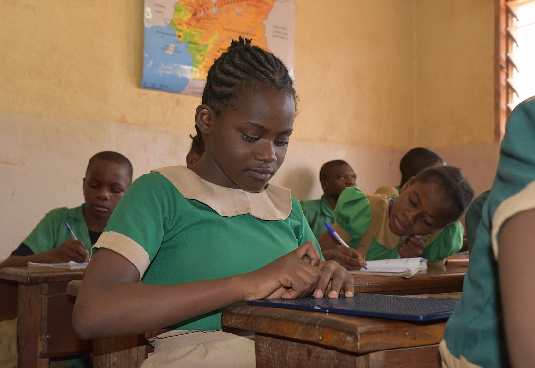 Während die anderen Papier und Stift zur Hand nehmen, greift Julienne im Unterricht zur Braille-Tafel. Die 13-Jährige aus Kamerun ist blind, und sie gehört zu den Besten in ihrer Klasse. Schnell flitzen ihre Finger über die Schreibtafel. Sie drücken mit dem Griffel die Punkte in das eingelegte Blatt der aufklappbaren Tafel. Inzwischen ist Julienne genauso flink wie ihre Mitschüler, wenn sie sich Notizen macht oder Klassenarbeiten schreibt.