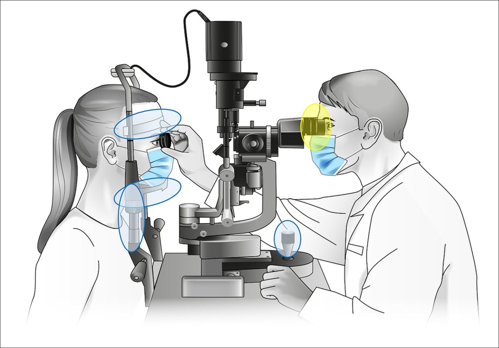 Bakterien auf Spaltlampen: hier Spaltlampe mit markierten Probenahmestellen der Studie (Fritz B. et al. (2021) (Bild: Hochschule Furtwangen)