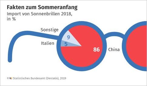 Wer zum Sommeranfang am 21. Juni zum Sonnenschutz mit Sonnenbrille zu sehen ist, trägt in vielen Fällen ein aus der Volksrepublik China importiertes Produkt: Wie das Statistische Bundesamt (Destatis) in Wiesbaden nach vorläufigen Zahlen mitteilt, kamen von den 59,2 Millionen im Jahr 2018 nach Deutschland importierten Sonnenbrillen 50,6 Millionen aus China (86%).