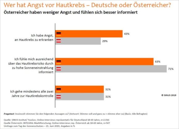 Die Angst, an Hautkrebs zu erkranken, ist in Österreich deutlich geringer als in Deutschland (29% Österreich vs. 43% Deutschland). Gleichzeitig fühlen sich unsere Nachbarn besser über das Hautkrebsrisiko durch zu hohe Sonneneinstrahlung informiert (71% Österreich vs. 63% Deutschland). Das hat Integral Marktforschung repräsentativ für Österreich herausgefunden.