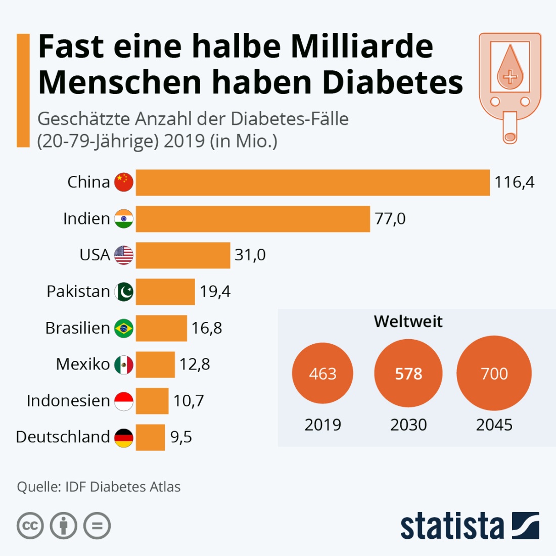 Deutschland zähle laut Statista mit rund 9,5 Millionen Betroffenen zu den Top-10-Ländern. Die meisten Fällen treten derzeit in China, Indien und in den USA auf. Experten rechnen für 2045 weltweit mit 700 Millionen Fällen – ein Plus von 51 Prozent.