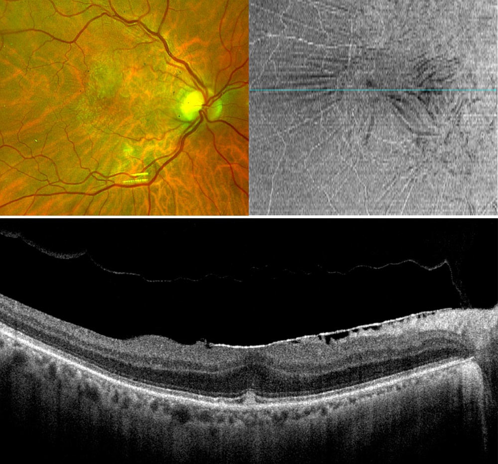 So lässt sich eine epiretinale Gliose mit verschiedenen diagnostischen Methoden darstellen: Die Laser-Scanning-Ophthalmoskopie (links oben) zeigt eine weiß-graue Membran mit Netzhautfalten im Bereich der Makula, die Enface optische Kohärenztomographie der Makulaoberfläche (rechts oben) verdeutlicht Traktionsrichtungen und Netzhautfalten und die hochauflösende optische Kohärenztomogaphie (unten) zeigt einen Scan durch die Fovea mit der epiretinalen Membran als hochreflektive helle Linie auf der Netzhautoberfläche (Quelle: AAD-Kongress 2021 / Schumann)