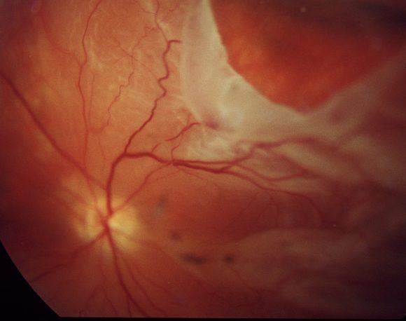 Als Ablatio oder Amotio retinae bezeichnet man die Ablösung der Netzhaut vom Pigmentepithel und von der dahinter liegenden Aderhaut. Zu den Risikofaktoren zählen vor allem: hochgradige Kurzsichtigkeit, diabetische Netzhautveränderungen, Entzündungen oder Tumore im Auge. Symptome: Wahrnehmung von Lichtblitzen, dann Verschleierung und Verschattung des Sehfeldes. Erblindungsgefahr, die durch rechtzeitige Behandlung gebannt werden kann: Laserkoagulation, Kälteanwendung, Wiederanlegen mithilfe einer Plombe (Bild: BVA)
