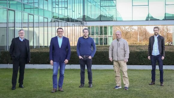 Interdisziplinäres Team (von links): Hans Schöler, Stephan Ludwig, Yotam Menuchin-Lasowski, Thomas Rauen und André Schreiber setzten humane Netzhaut-Organoide erfolgreich für die Erforschung von SARS-CoV-2 ein (Foto: MPI Münster)