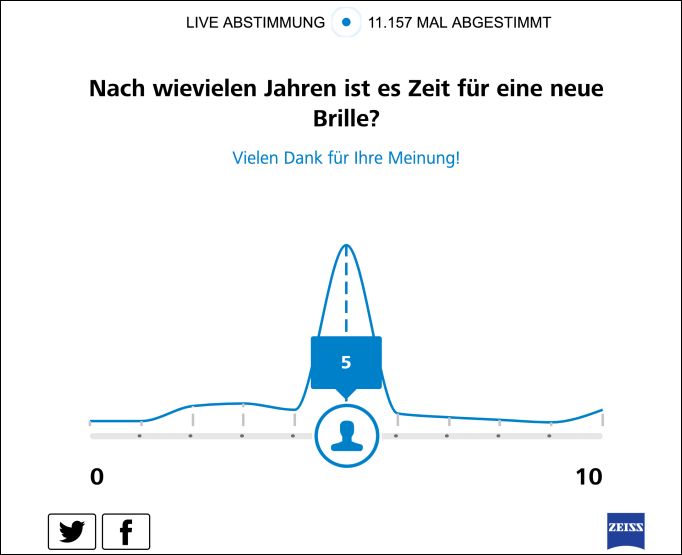 Geradezu aufrüttelnd ist, dass bei 11.154 Abstimmungen die meisten Teilnehmer der Meinung sind, dass man erst nach fünf Jahren eine neue Brille braucht (Grafik 1).