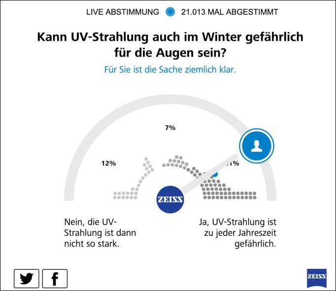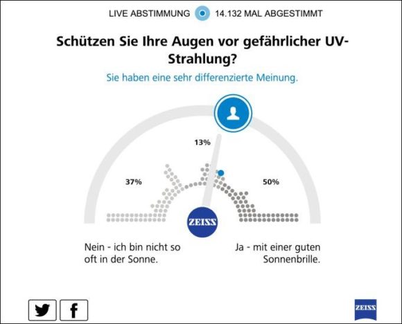 Und was sagen die Endverbraucher selbst zum Thema UV-Schutz der Augen? Die sich an diese Studie anschließende Verbraucher-Umfrage wurde online mittels der Technologie eines Berliner Startup-Unternehmens durchgeführt. Die Meinungsumfragen wurden dafür auf Medienseiten – Online-News-Seiten, wie FAZ, Stern, HuffPost und andere mehr – platziert, wobei 69 Mio. User im Monat erreicht werden. Dabei sind die Umfragen zwar sind nicht repräsentativ, spiegeln aber ein relativ verlässliches Meinungsbild wider. Im aktuellen Fall basieren die Ergebnisse auf 47.629 Abstimmungen.