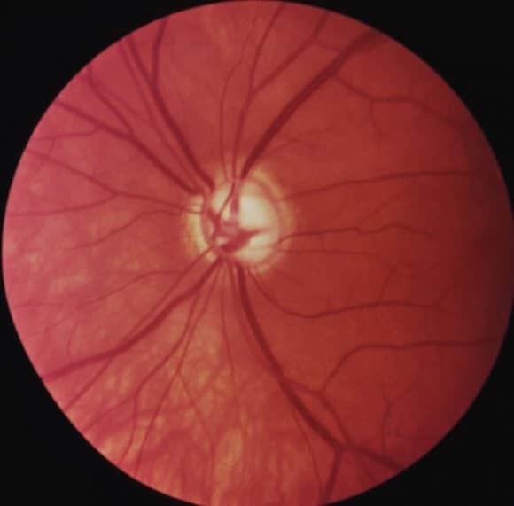 Sehnervenkopf mit bereits ungewöhnlich großer Ausbuchtung in der Mitte. Bevor die ersten Gesichtsfeldausfälle auftreten, verändert sich die Papille (Foto: BVA)