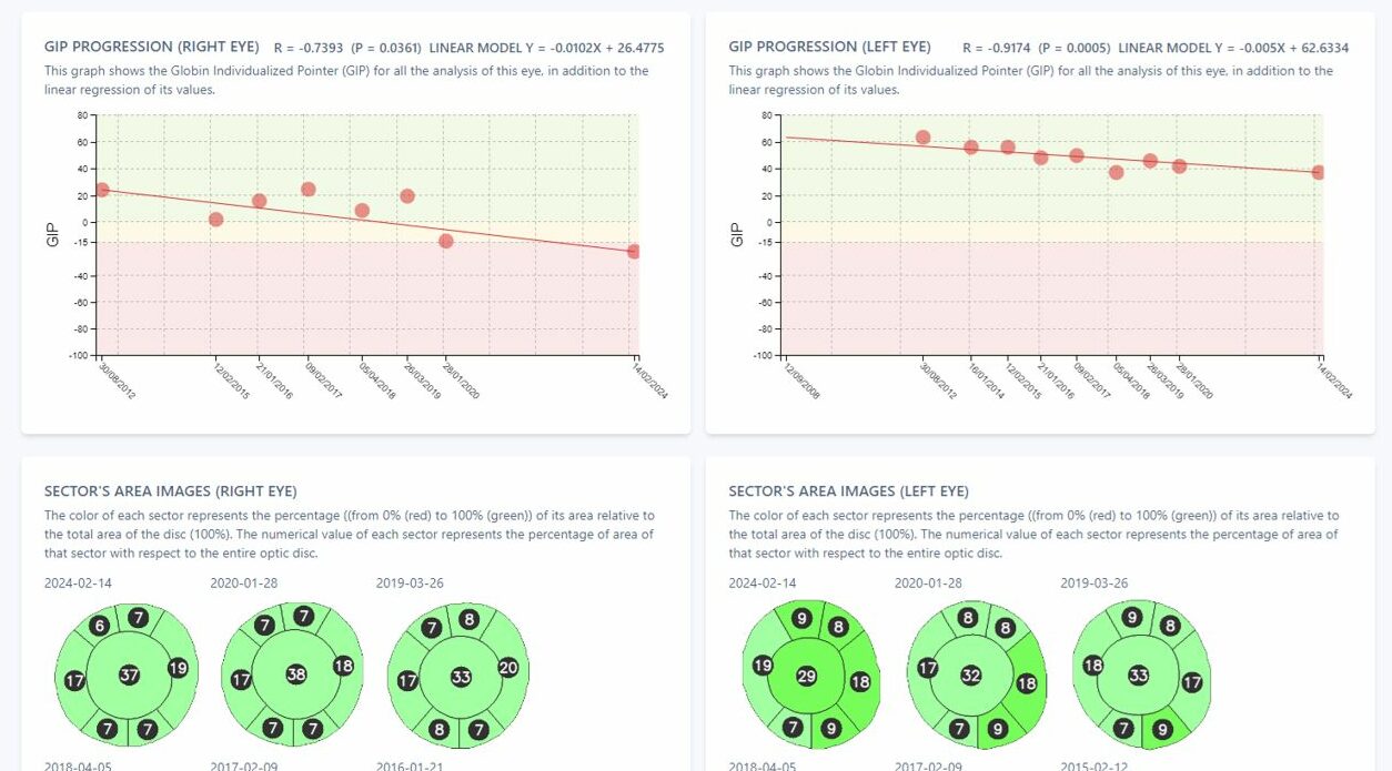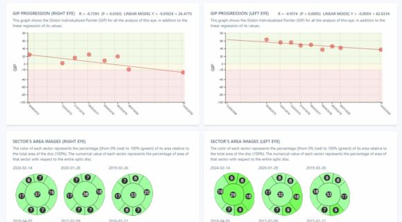 Eine weitere Stärke der Advanced Glaucoma Progression AI liegt in der gleichzeitigen Analyse beider Augen. Optiker und Augenärzte können so die Ergebnisse nebeneinander betrachten und vergleichen, um ein umfassendes Bild der Sehnervgesundheit und der umliegenden Strukturen zu erhalten.