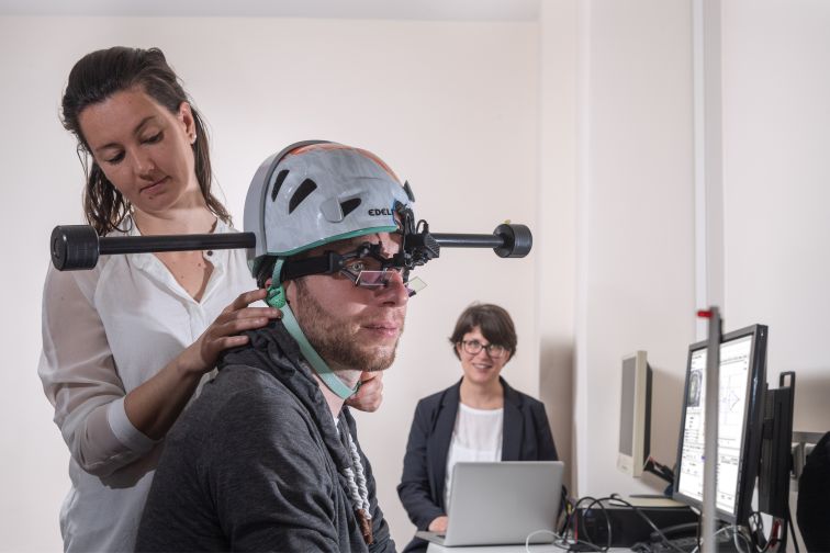Dr. Cecilia Ramaioli (links) überprüft den Sitz des Helms mit Gewichten bei einem Probanden. Prof. Nadine Lehnen stellt im Hintergrund den Computer für das Schwindel-Experiment ein (Bild: A. Heddergott / TUM)