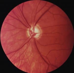 BVA: Glaukom-Papille - Sehnervenkopf mit bereits großer Ausbuchtung in der Mitte