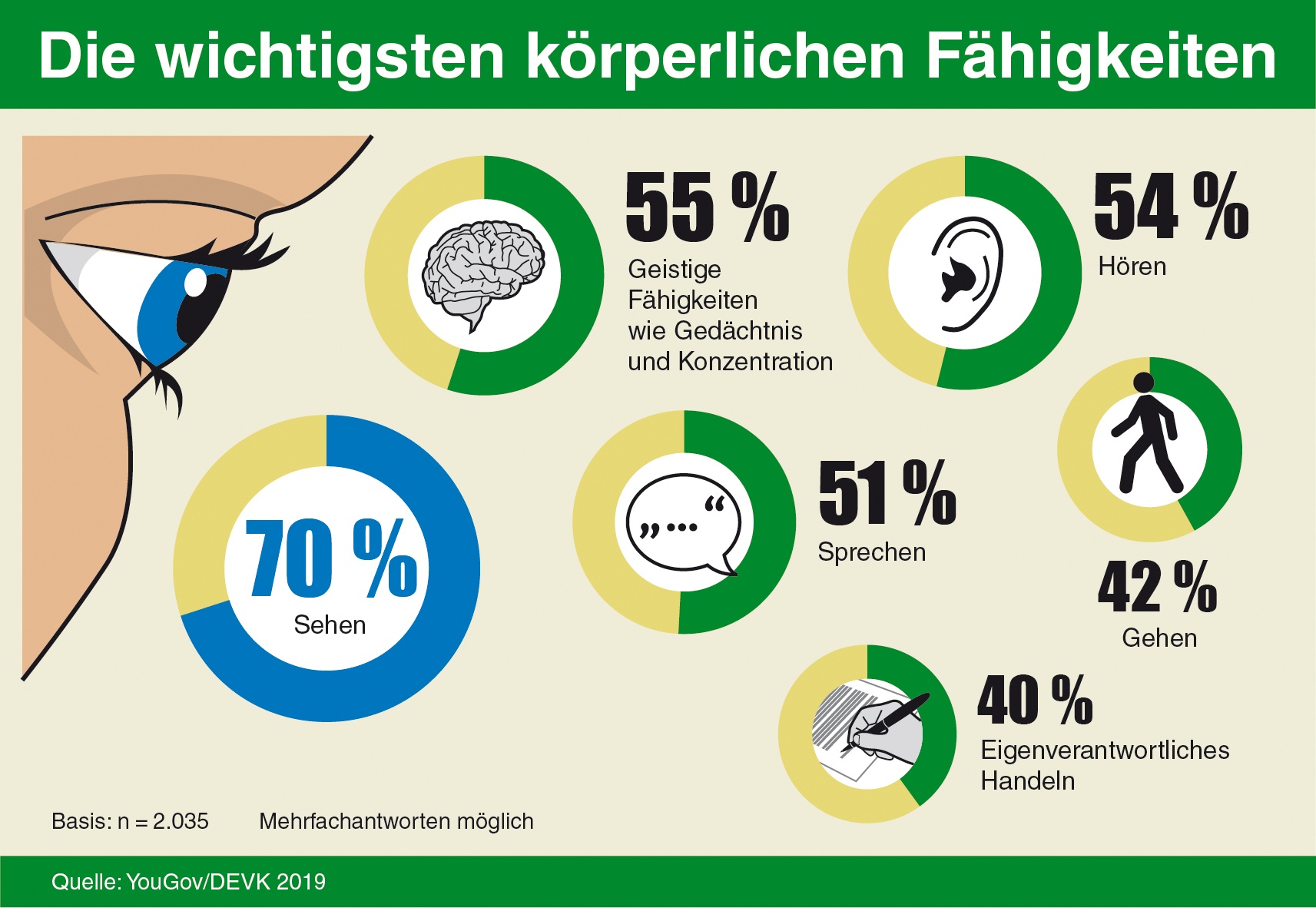 Einer repräsentativen YouGov-Umfrage im Auftrag der DEVK Versicherungen zum „Stell-dich-deinen-Ängsten-Tag“ Anfang Oktober unter mehr als 2.000 Bundesbürgern ab 18 Jahren zufolge legten die meisten Befragten vor allem Wert aufs Sehen, geistige Fähigkeiten und Hören.