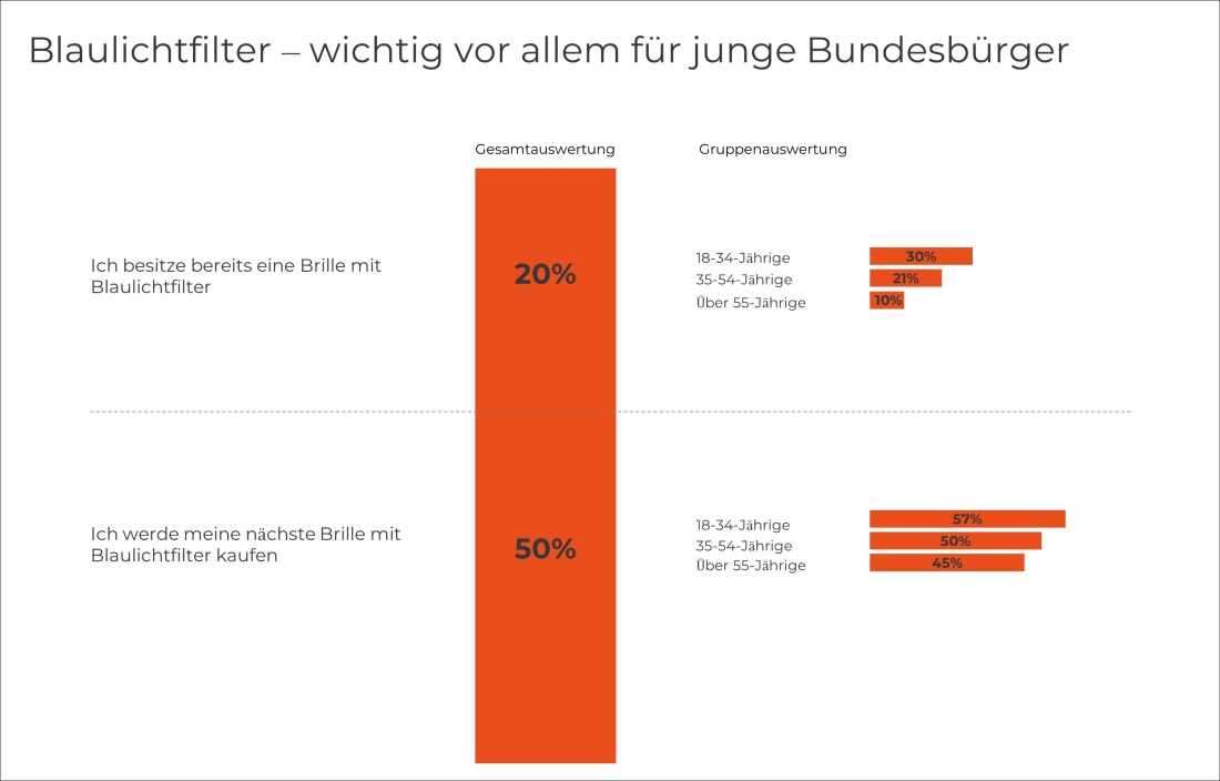 Allmählich scheinen sich die Gefahren des blauen Lichts bei den Deutschen aber herumzusprechen. So gab die Hälfte der Befragten in der Studie an, beim nächsten Brillenkauf auf Gläser mit Blaulicht-Filter achten zu wollen.