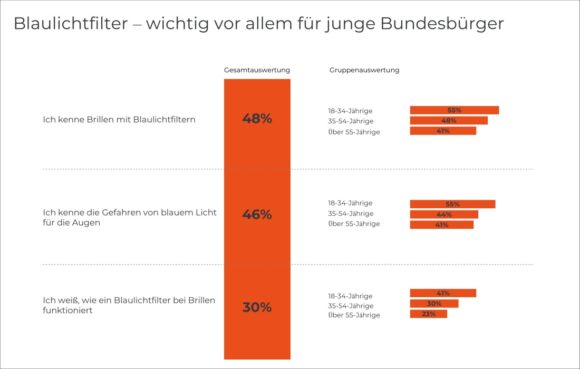 Jeder zweite Bundesbürger hat bereits von Brillen mit Blaulicht-Filtern gehört, zeigt die Studie „Optics 2021 – So ticken die Deutschen beim Thema Brille“. Vor allem die 18- bis 34-Jährigen finden ihn wichtig. Doch die wenigsten wissen, wie er funktioniert. Michael Busch: „Der Filter verhindert, dass zu viel blaues Licht die Augen erreicht, indem er den kurzwelligen Anteil des Lichts nicht durchlässt. Die Lesbarkeit des Displays wird dadurch aber nicht eingeschränkt.“
