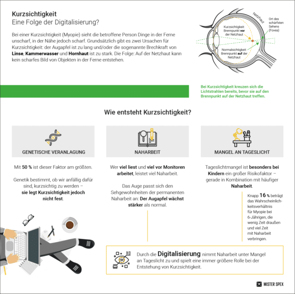 Für dieses Phänomen gibt es eine relativ einfache Erklärung: Die Digitalisierung schadet unseren Augen. Vor allem wer bereits in jungen Jahren viel Naharbeit leistet, fördert damit die eigene Kurzsichtigkeit. Da das Auge sehr anpassungsfähig ist, gewöhnt es sich an vorwiegende Sehgewohnheiten – diese werden bei den 21-30-jährigen von bis zu sieben Stunden Zeit im Internet täglich geprägt. Das heißt in vielen Fällen, auf einen Bildschirm zu starren, der künstliches Licht ausstrahlt – auch dieses beeinflusst unsere Augen negativ, wie das Brien Holden Vision Institut und das Eye Research Institut in Singapur herausfanden.