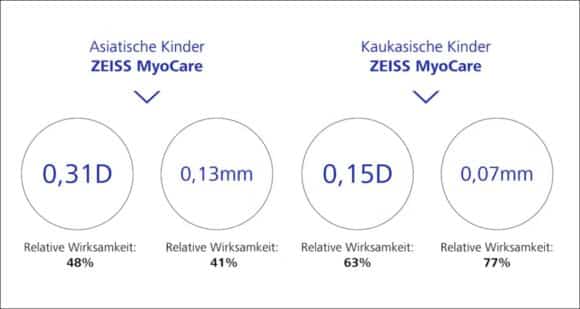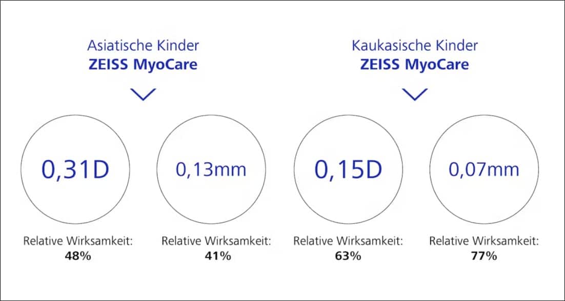 Die Brillengläser verlangsamten demnach das Fortschreiten der Kurzsichtigkeit sowohl bei kaukasischen als auch bei asiatischen Kindern signifikant – im Vergleich zu Zeiss-Einstärkengläsern. Nach zwölf Monaten Tragezeit von Zeiss MyoCare wurde die Myopie-Progression bei asiatischen Kindern im Durchschnitt um 0,31 dpt bzw. 0,13 mm reduziert (relative Wirksamkeit von 48 % und 41 %) und mit Zeiss MyoCare S im Durchschnitt um 0,29 dpt und 0,11 mm (relative Wirksamkeit von 45 % und 34 %).