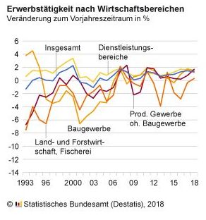 Im Produzierenden Gewerbe (ohne Baugewerbe) erhöhte sich die Erwerbstätigkeit und die Zahl der Erwerbstätigen im Jahr 2018 laut Statistischem Bundesamt überdurchschnittlich um 139.000 Personen (+1,7%). Im Baugewerbe betrug der Anstieg 37.000 Personen (+1,5%), in der Land- und Forstwirtschaft, Fischerei 2.000 Personen (+0,3%).