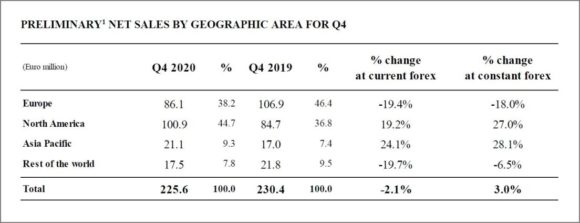 Der Nettoumsatz im vierten Quartal 2020 belief sich demnach auf 225,6 Mio. Euro, ein Plus von 3,0% bei konstanten Wechselkursen (-2,1 % bei aktuellen Wechselkursen) im Vergleich zu 230,4 Mio. Euro im gleichen Quartal 2019.