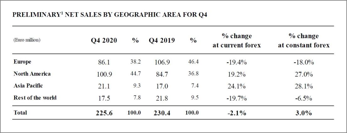 Vorläufige Umsatzerlöse nach geografischen Regionen für das vierte Quartal 2020 (Quelle: Safilo)