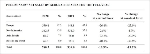 Vorläufiger Nettoumsatz nach geografischen Gebieten für das Gesamtjahr 2020 (Quelle: Safilo)
