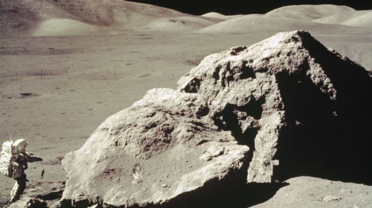 Während der Mission Apollo 17, der siebten und letzten bemannten Mondlandung, entfernten die Astronauten Abschnitte aus großen Felsformationen, um sie zur Erde zurückzubringen (Quelle: NASA)