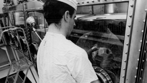 Ein Labortechniker inspiziert die Ergebnisse der Apollo-11-Mission durch Handschuhfächer und hinter Schutzglas (Quelle: NASA)