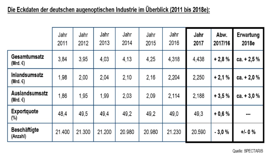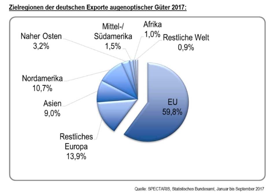 Die deutsche augenoptische Industrie hat ihren Umsatz im Jahr 2017 um 2,8 Prozent auf 4,44 Milliarden Euro gesteigert. Der Inlandsumsatz sei dabei um 2,1 Prozent auf 2,25 Milliarden Euro gewachsen, der Auslandsumsatz um 3,5 Prozent auf 2,19 Milliarden Euro. 74 Prozent der Ausfuhren gingen in die europäischen Länder, 11 Prozent nach Nordamerika und 9 Prozent nach Asien. Die Exportquote der deutschen augenoptischen Industrie lag bei 49,3 Prozent. Erfreuliche Zuwachsraten habe es bei den Exporten in die USA gegeben sowie in die direkten deutschen Anrainerstaaten. Ein Brexit-Schatten lag bereits über den Ausfuhren nach Großbritannien, die 4,8 Prozent gegenüber dem Vorjahr einbüßten.