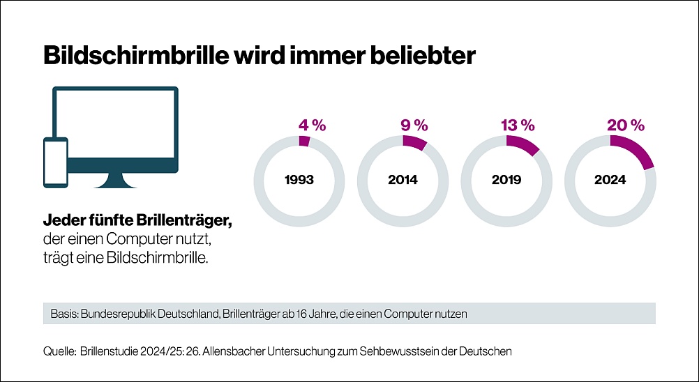 Die Studie zeigt auch: Der digitale Alltag prägt zunehmend die Anforderungen an gutes Sehen. Jeder Fünfte der fehlsichtigen Befragten nutzt inzwischen eine spezielle Bildschirmbrille – 2019 waren es 14 Prozent.