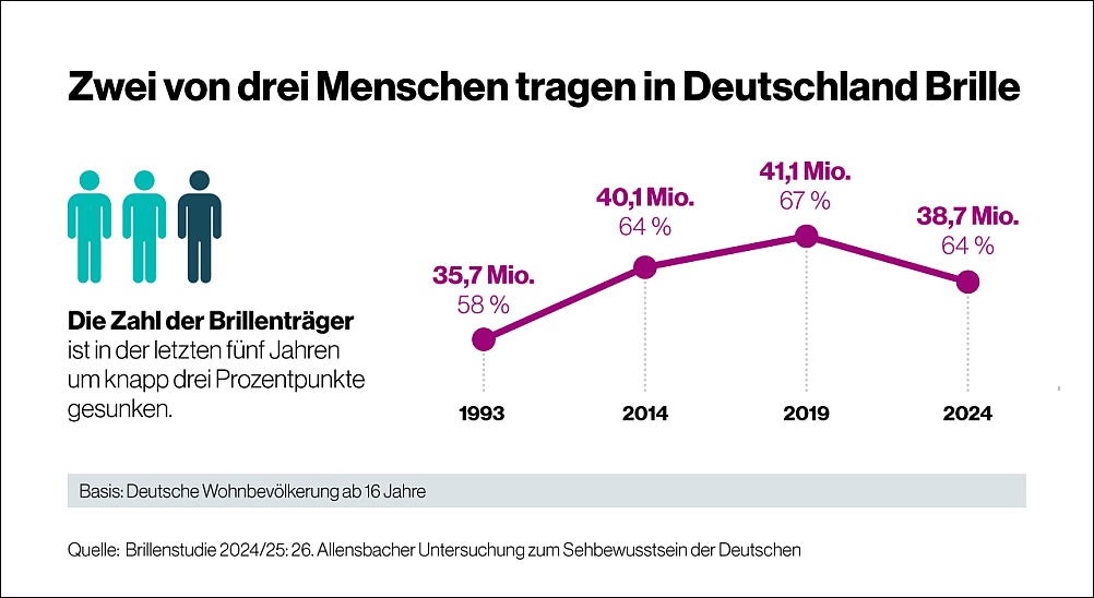 2024 trugen knapp 39 Millionen Menschen in Deutschland eine Brille. Ihre Zahl ist laut der 26. Allensbach-Studie während der letzten fünf Jahre von 67 auf 64 Prozent gesunken. Der Rückgang sei fast ausschließlich auf weniger gelegentliche Brillentragende zurückzuführen, während die Zahl der ständigen Nutzer konstant geblieben ist.