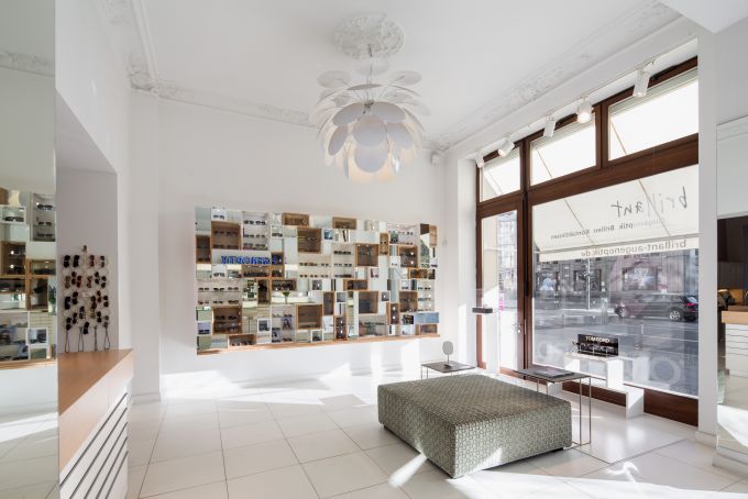 Luftig, weitläufig, lichtdurchflutet und auch ästhetisch anziehend, ohne einzuschüchtern. Das ist der erste Eindruck, wenn man Brillen in Mitte an der Friedrichstraße 133 an diesem sonnigen Nachmittag betritt und sich sofort eingeladen fühlt, leichtfüßig weiter zu flanieren. Das stilvolle Entree passt hervorragend zu dem umtriebigen Ort, schließlich residiert man vis à vis von Deutschlands größter Showbühne, dem legendären Friedrichstadt-Palast, in den jeden Abend bis zu 1.900 Besucher strömen, derzeit gastiert eine Revue mit Kostümen von Modeschöpfer Jean Paul Gaultier.