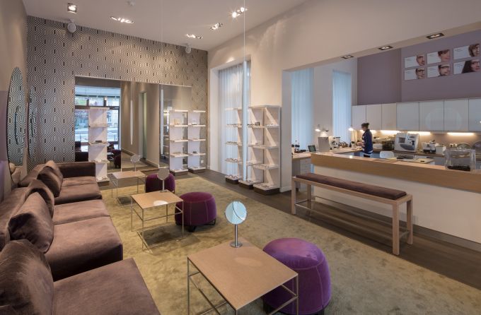 Der hintere, um eine Treppenstufe erhöhte Beratungsraum ist mit Minotti-Sofas bestückt und erinnert an Salonkultur mit flauschiger Gemütlichkeit (weiter hinten dann die Refraktionsräume). Die Polster im edlen Look sind in einem satten Lilaton. Sofort erinnert man sich daran, dass Ultra-Violett ja laut Farbinstitut Pantone die Farbe der Saison sein soll.