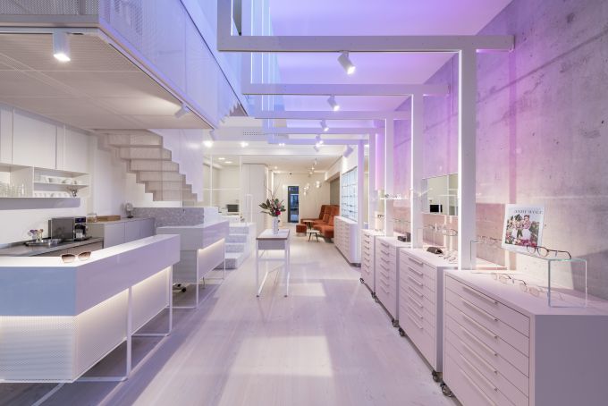 Weiß und edel ist der Eingangsbereich, auf der linken Seite ein Tresen, der auch als Kaffeebar dient, rechts dann eine puristische Präsentation ausgewählter Brillen. Zur Beratung kann es sich der Kunde auf einer großzügigen Sofa-Landschaft bequem machen. Wer es intimer mag, darf sich ins Studio im ersten Stock zurückziehen und dort in aller Ruhe nach einer geeigneten Brille suchen.