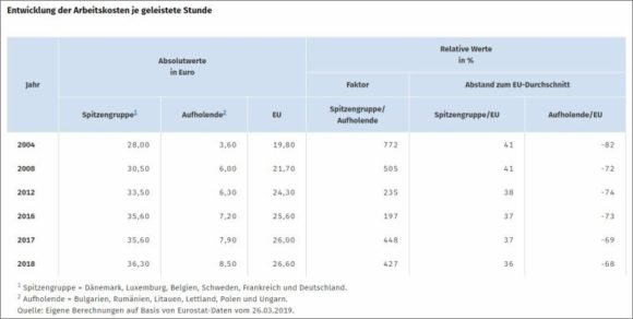 Insgesamt betrugen die Arbeitskosten in der Spitzengruppe mehr als das Vierfache (427%) des Wertes der aufholenden Länder. Dieser Abstand hat sich seit dem Jahr 2004, als erstmals vergleichbare Zahlen für alle relevanten Mitgliedstaaten vorlagen, allerdings mehr als halbiert. Damals betrugen die durchschnittlichen Arbeitskosten in der Spitzengruppe mit 28,00 Euro noch fast das Achtfache (772%) des Niveaus der Kontrastgruppe von 3,60 Euro.