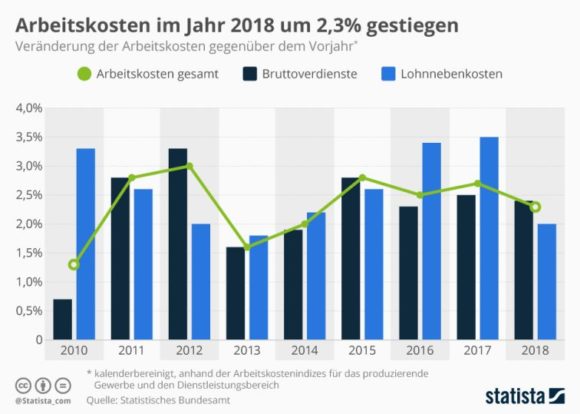 Arbeitskosten setzen sich aus den Bruttoverdiensten und den Lohnnebenkosten zusammen. Im Jahr 2018 zahlten die Arbeitgeber in Deutschland in Branchen des Produzierenden Gewerbes und der wirtschaftlichen Dienstleistungen auf 100 Euro Bruttoverdienst zusätzlich 27 Euro Lohnnebenkosten. Damit lagen die Lohnnebenkosten in Deutschland unter dem EU-Durchschnitt von 30 Euro. Im EU-weiten Ranking lag Deutschland im Mittelfeld auf Platz 14. Auf 100 Euro Lohn wurden in Schweden (48 Euro) die höchsten Lohnnebenkosten gezahlt, in Malta (8 Euro) die niedrigsten.