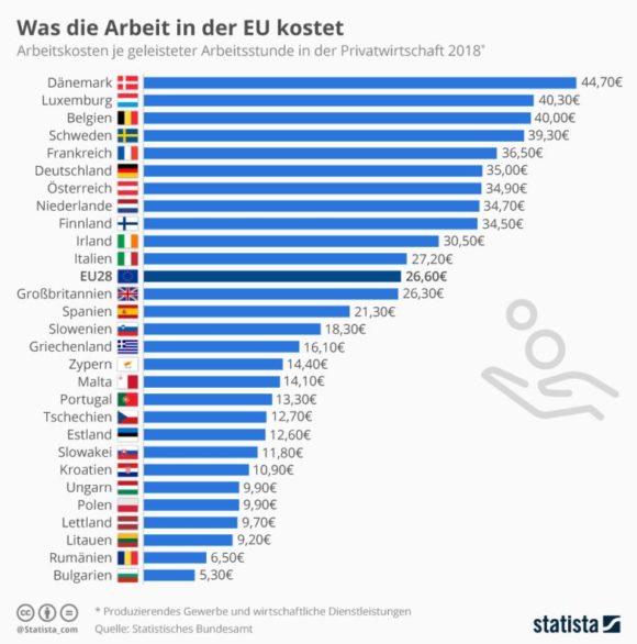 (Wiesbaden) – Arbeitgeber des deutschen Produzierenden Gewerbes und wirtschaftlicher Dienstleistungen bezahlten im Jahr 2018 durchschnittlich 35,00 Euro für eine geleistete Arbeitsstunde. Wie das Statistische Bundesamt (Destatis) anlässlich des Internationalen Tags der Arbeit am 1. Mai weiter mitteilt, lag das Arbeitskosten-Niveau in Deutschland damit innerhalb der Europäischen Union (EU) wie im Jahr zuvor auf Rang 6. Dänemark hatte mit 44,70 Euro die höchsten Arbeitskosten je geleistete Stunde, Bulgarien mit 5,30 Euro die niedrigsten.