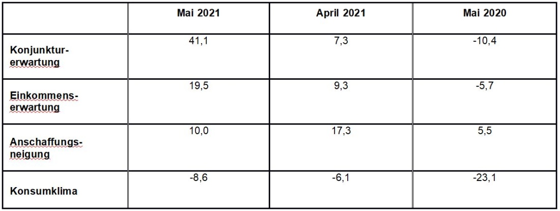 Im Sog sprunghaft angestiegener Konjunktur-Aussichten legt auch die Einkommens-Erwartung im Mai zu. Nach einem Plus von 10,2 Zählern klettert der Indikator auf 19,5 Punkte. Damit macht er einen wesentlichen Teil der Verluste aus dem Vormonat (-13 Punkte) wieder wett. Im Vergleich zum entsprechenden Zeitraum des Vorjahres stehe momentan ein Plus von mehr als 25 Punkten zu Buche.