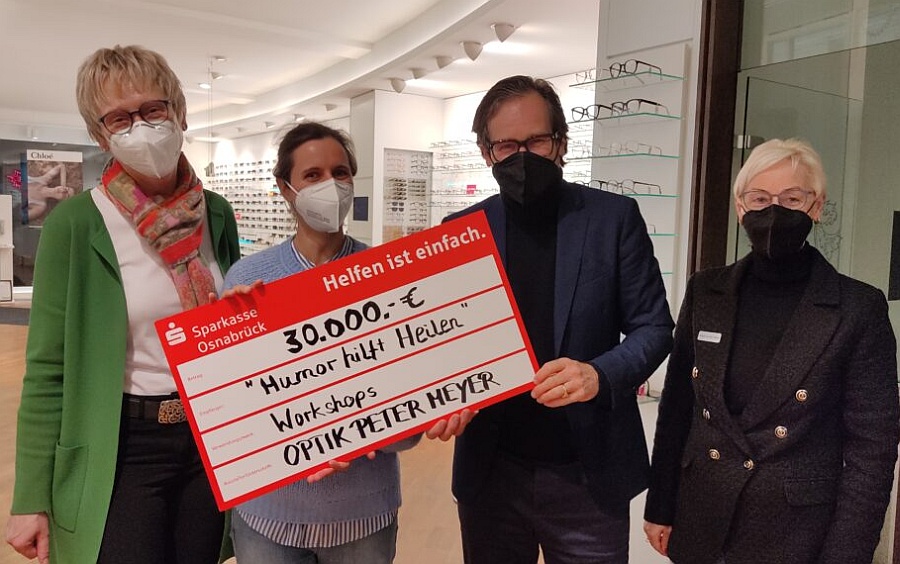 Mitte November wurde der Scheck bei Optik Peter Meyer in Osnabrück überreicht. Mit der Spende wird die Stiftung Humor Hilft Heilen Humor-Workshops in den Regionen der beteiligten Augenoptiker*innen finanzieren – darunter auch mehrere Pflege-Workshops in Osnabrücker Kliniken.