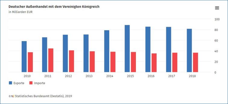 Nach den vorläufigen Ergebnissen der Außenhandelsstatistik wurden laut Destatis von Januar bis Juli 2019 Waren im Wert von 47,1 Milliarden Euro von Deutschland nach Großbritannien exportiert und Waren im Wert von 21,3 Milliarden Euro aus dem Vereinigten Königreich nach Deutschland importiert. Damit gingen die deutschen Exporte um 4,6% gegenüber dem vergleichbaren Vorjahreszeitraum zurück, während die Importe aus dem Vereinigten Königreich um 3,7% sanken. Der Überschuss in der Außenhandelsbilanz betrug damit 25,8 Milliarden Euro.