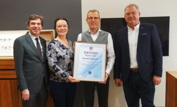 Am 16. Januar 2020 konnte Augenoptiker Michael Wolf, Optik Wolf in Dingolfing, das Zertifikat zum „Spezialist Gleitsicht +“ der Wissenschaftlichen Vereinigung für Augenoptik und Optometrie (WVAO) entgegennehmen. Im Rahmen einer Pressekonferenz dankten WVAO-Vorstandsmitglied Sabine Schlicht und Geschäftsführer RA Hartmut Glaser für dessen „besonderes Engagement und die herausragende fachlich überprüfte Leistung“.