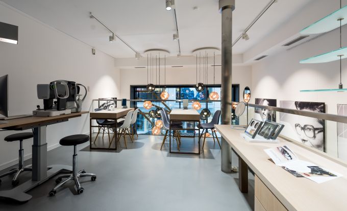 Das Geschäft selbst ist von klaren Strukturen und wenigen Materialien geprägt: Naturholz in Form von weiß gekalkter Eiche, weiße Wände, graue Schrankflächen sowie hellgrauer Boden (Edelestrich). Die Fassungen kommen so am besten zur Geltung. 60 Quadratmeter in der unteren Etage dienen als Verkaufsfläche, oben stehen 40 Quadratmeter für Optometrie zur Verfügung. Ein Dorado für die sieben angestellten Meister und hochqualifizierten Gesellen. Eine Lounge lädt zum Verweilen ein: Wohlfühlen ist ein wichtiger verkaufsfördernder Faktor, gehört zum Thema Liebe.