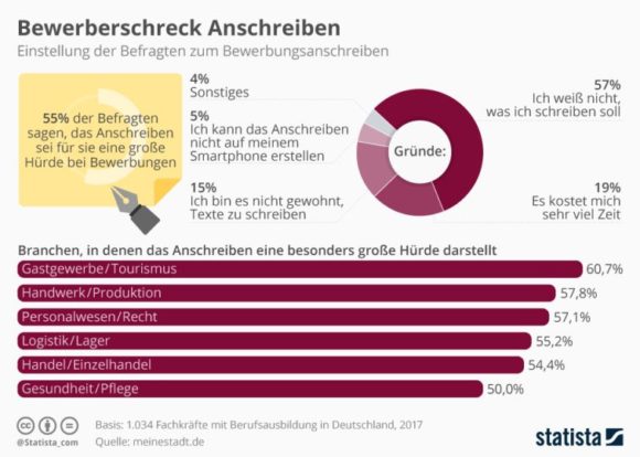 Die größte Herausforderung bei den Bewerbungsunterlagen ist laut Statista für Bewerber das Anschreiben, wie eine Umfrage von meinestadt.de ergab. Mehr als die Hälfte des Befragten sahen 2017 darin die größte Hürde. Ratlosigkeit über den Inhalt und zu hoher zeitlicher Aufwand seien die meistgenannten Gründe dafür.