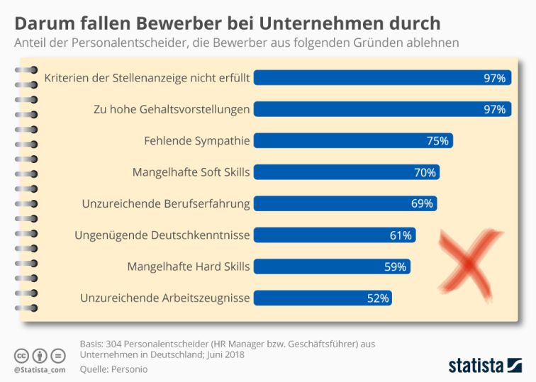 Weitere Gründe für Absagen: fehlende Sympathie, mangelnde Erfahrung, schlechte Deutschkenntnisse, fehlende Hard Skills oder auch „unzureichende Arbeitszeugnisse“, wie die Daten ergaben.