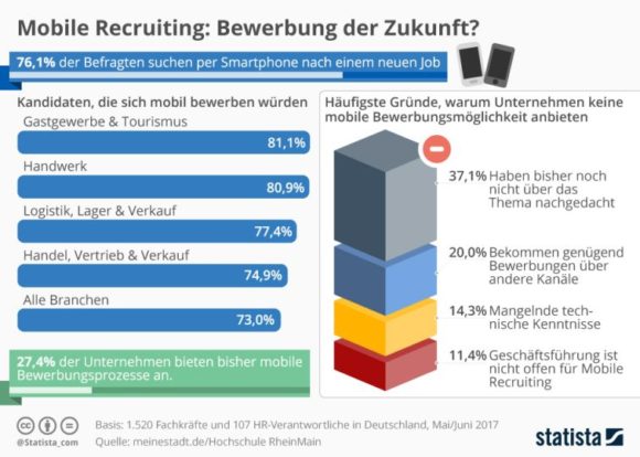 Der Trend bei Bewerbungen geht ohnehin zur kurzen schnellen Online-Bewerbung, vor allem übers Smartphone. So suchten laut Statista 2017 drei von vier Fachkräften eine neue Stelle per Smartphone (73 Prozent). Im Gegensatz dazu boten nur 27,4 Prozent der Unternehmen diese Option an, wie die gemeinsame Umfrage vom Jobportal meinestadt.de und Hochschule RheinMain ergab.
