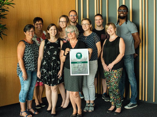 Das Team freut sich sichtlich über die Klimaneutral-Urkunde (Bild: BiP)