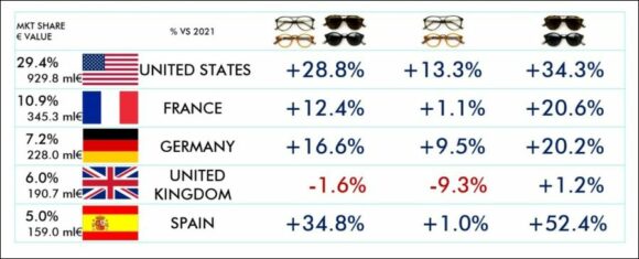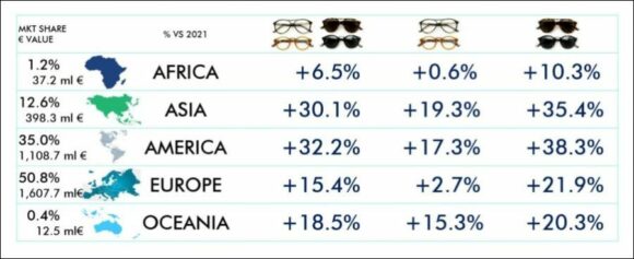In den ersten 8 Monaten des Jahres 2022 habe sich die italienische Brillen-Industrie sehr gut entwickelt, vor allem im Hinblick auf die Exporte, die etwa 90 % der Gesamtproduktion des Sektors ausmachen. Die ANFAO-Daten für den Zeitraum Januar bis August zeigten einen Anstieg von 22,4 % gegenüber dem gleichen Zeitraum 2021 und einen Gesamtwert von 3,231 Mrd. Euro.