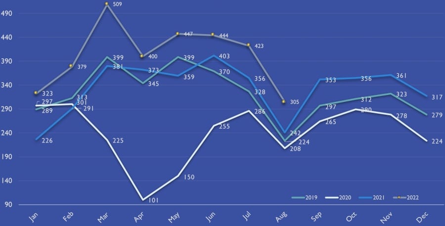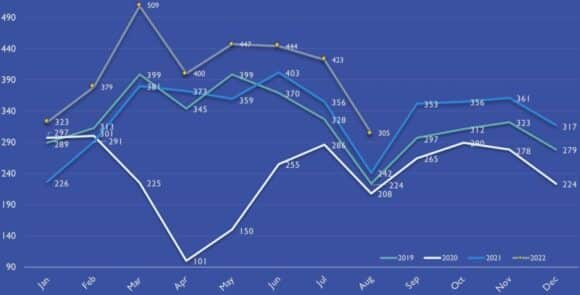 Betrachtet man die monatliche Entwicklung der Exporte in den ersten 8 Monaten des Jahres 2022, so folgte der Trend dem der Vorjahre mit konstantem Wachstum und einer wichtigen Spitze im März, die deutlich über der bisherigen Branchenleistung von 2019 liegt.