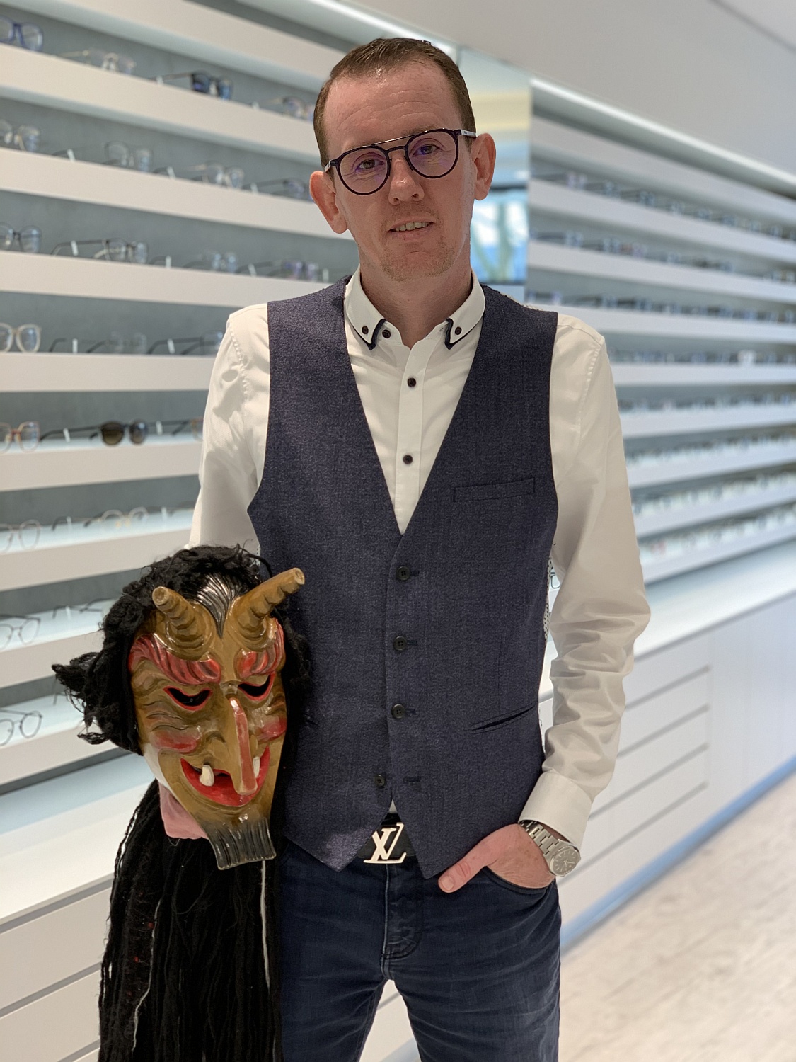Ein Optiker in Freiburg hat für eine Narrenmaske zur Fastnacht eine spezielle Brillenkonstruktion gebaut, die man im Inneren der Maske anbringen kann. Denn eine normale Brille lässt sich nicht gut unter der Maske tragen. Die Haltevorrichtung waren bei dem Modell, das er mir geschickt hatte, zwei Stifte. Aber es gibt noch weitere praktikable Haltemechanismen, die man sich schützen lassen sollte. Etwa über eine Klemmvorrichtung oder mit einem Klettband.